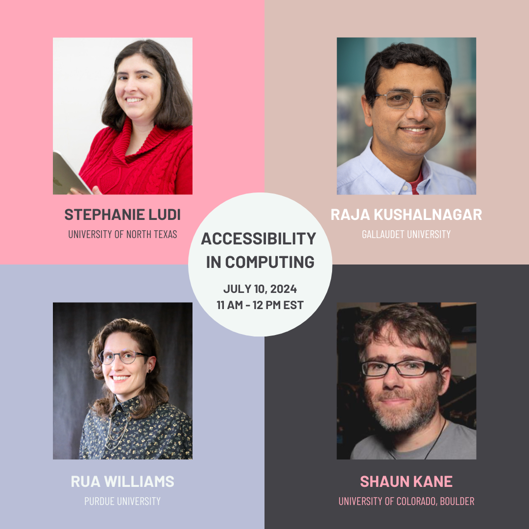 Description: The ever-changing landscape of technology, the computing industry, and resulting societal impacts carry great potential for persons with disabilities. Join the ACM DEI Council as it hosts a panel on July 10, 2024 at 11 AM EST, titled "Accessibility in Computing: Trends, Challenges and Opportunities." Panelists will explore a range of topics about the current trends in accessibility in computing and how the industry is incorporating inclusive designs to meet diverse needs. Panelists will also discuss the gaps in accessibility that technology companies and others should address to create a more inclusive digital space. The panel will be moderated by Dr. Stephanie Ludi. Panelists featured will be: Drs. Rua Williams, Shaun Kane, and Raja Kushalnagar.