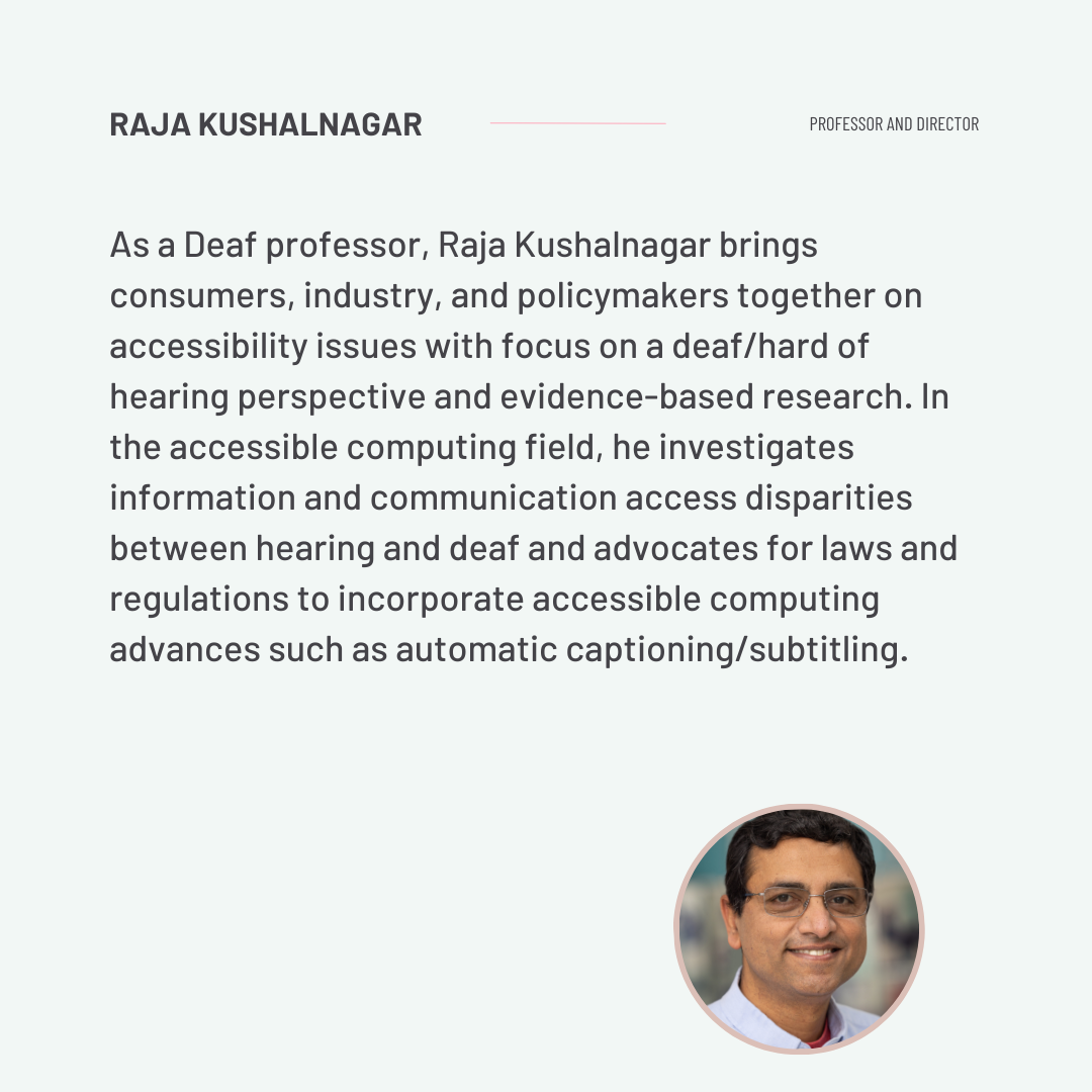 Dr. Raja Kushalnagar is a Professor and Director of the Information Technology undergraduate program and Accessible Human-Centered Computing graduate program at Gallaudet University in Washington, DC. With over fifteen years of experience in the accessible technology field and his own experiences as a deaf individual, Raja brings a wealth of lived experience and research to the field. He focuses on strategic planning, local industry, alumni relations, and faculty support.