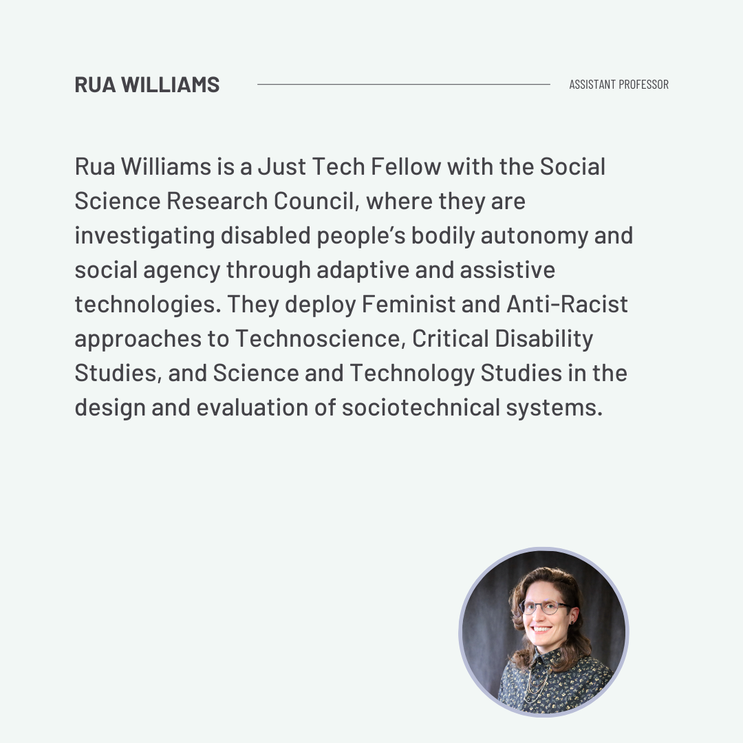 Dr. Williams is an Assistant Professor of User Experience Design at Purdue University in Indiana, USA. They are a Just Tech Fellow with the Social Science Research Council, where they are investigating disabled people’s bodily autonomy and social agency through adaptive and assistive technologies. Dr. Rua M. Williams is the Principal Investigator for the CoLiberation Lab, which studies interactions between technology design, technology research practices, and Disability Justice. Dr. Williams deploys Feminist and Anti-Racist approaches to Technoscience, Critical Disability Studies, and Science and Technology Studies in the design and evaluation of sociotechnical systems. Through their scholarship they illustrate injustice in technology while simultaneously uplifting marginalized users’ practices of resistance and revolution.