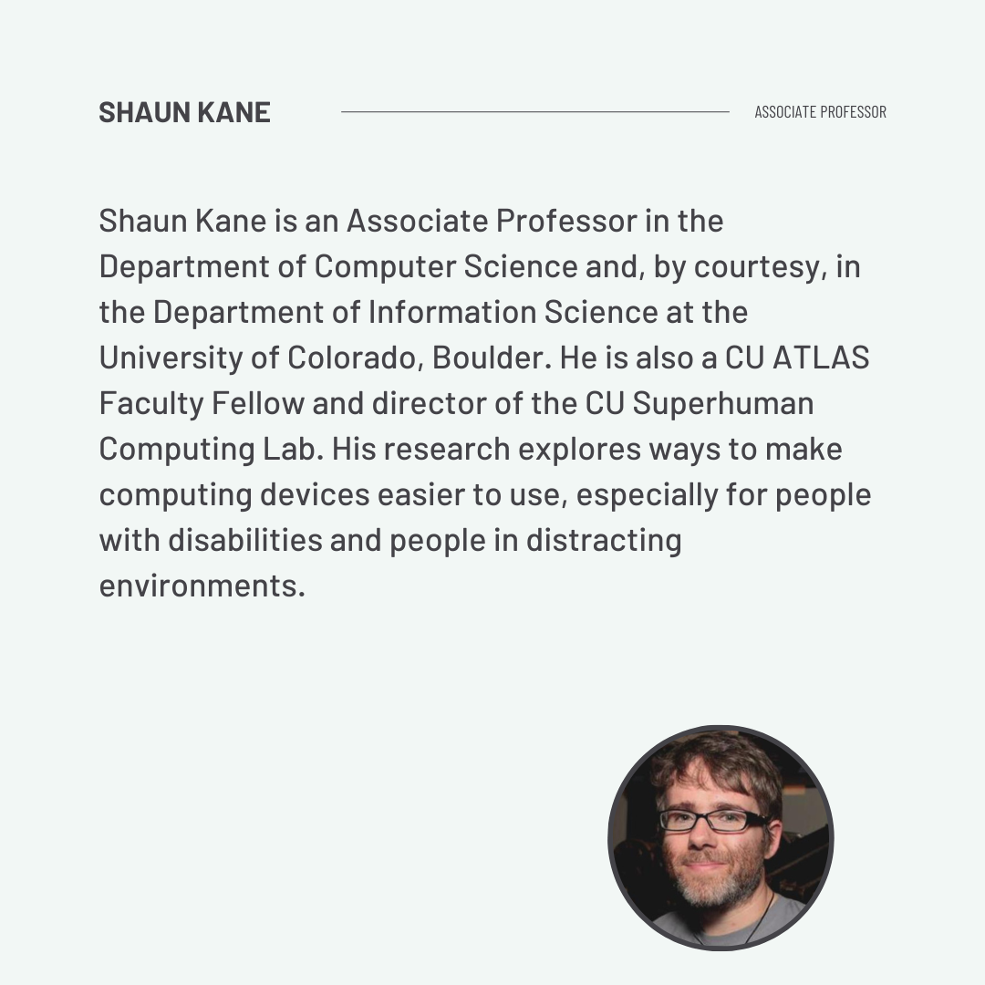 Shaun Kane is an Associate Professor in the Department of Computer Science and, by courtesy, in the Department of Information Science at the University of Colorado, Boulder. He is also a CU ATLAS Faculty Fellow and director of the CU Superhuman Computing Lab. His research explores ways to make computing devices easier to use, especially for people with disabilities and people in distracting environments. His research has been supported by a Google Lime Scholarship, a UMBC Academic Innovation Fellowship, and an Alfred P. Sloan Fellowship. He received his PhD from The Information School at the University of Washington in 2011, and was an assistant professor in the Department of Information Systems at the University of Maryland, Baltimore County from 2011 to 2014.