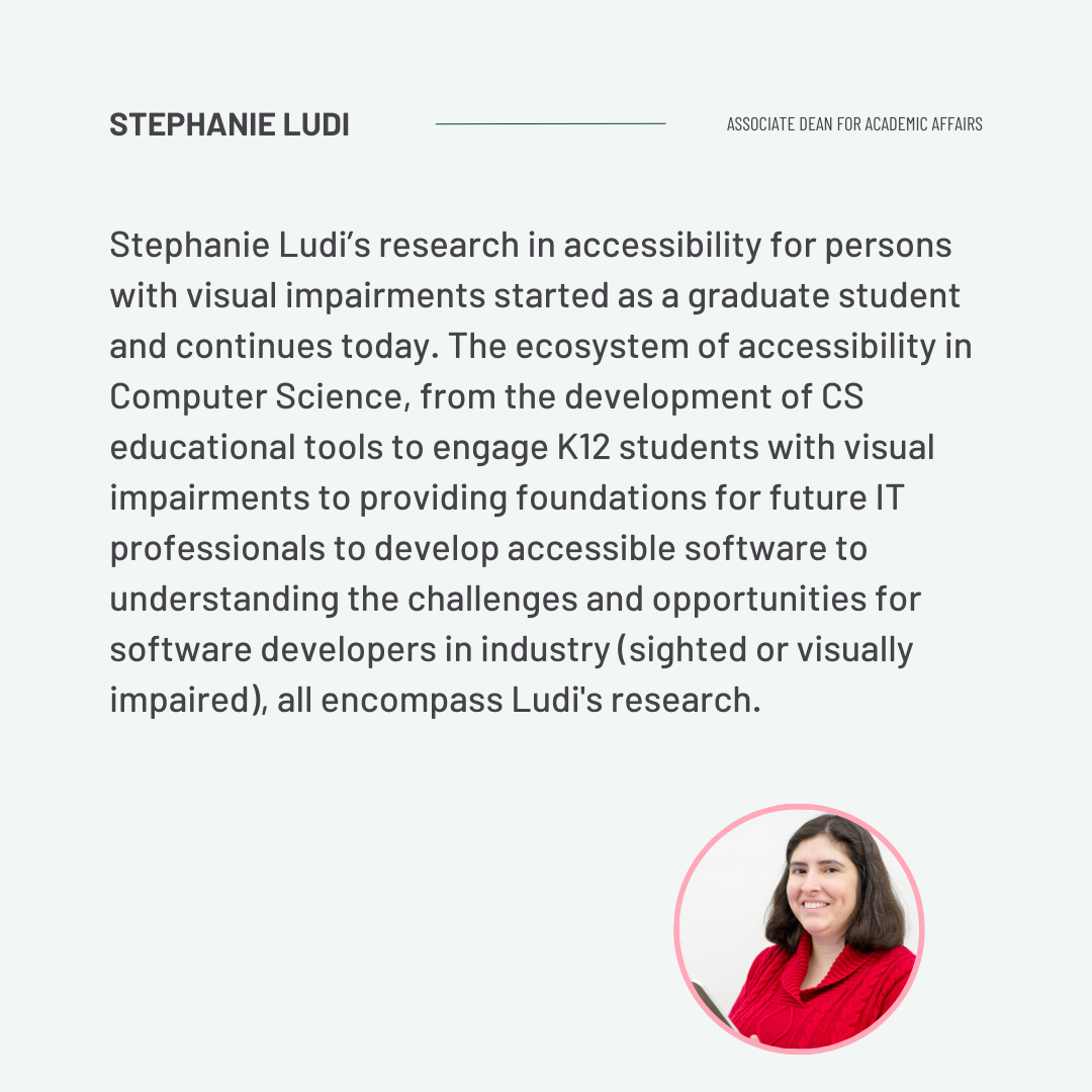 Dr. Stephanie Ludi is an Associate Dean for Academic Affairs in the College of Engineering at the University of North Texas. Dr. Ludi earned her baccalaureate degree from California Polytechnic University, San Luis Obispo and her PhD from Arizona State University. Her research in accessibility for persons with visual impairments started as a graduate student and continues today. The ecosystem of accessibility in Computer Science, from the development of CS educational tools to engage K12 students with visual impairments to providing foundations for future IT professionals to develop accessible software to understanding the challenges and opportunities for software developers in industry (sighted or visually impaired), all encompass Dr. Ludi's research. Work has been funded by the National Science Foundation, as well as philanthropic foundations.